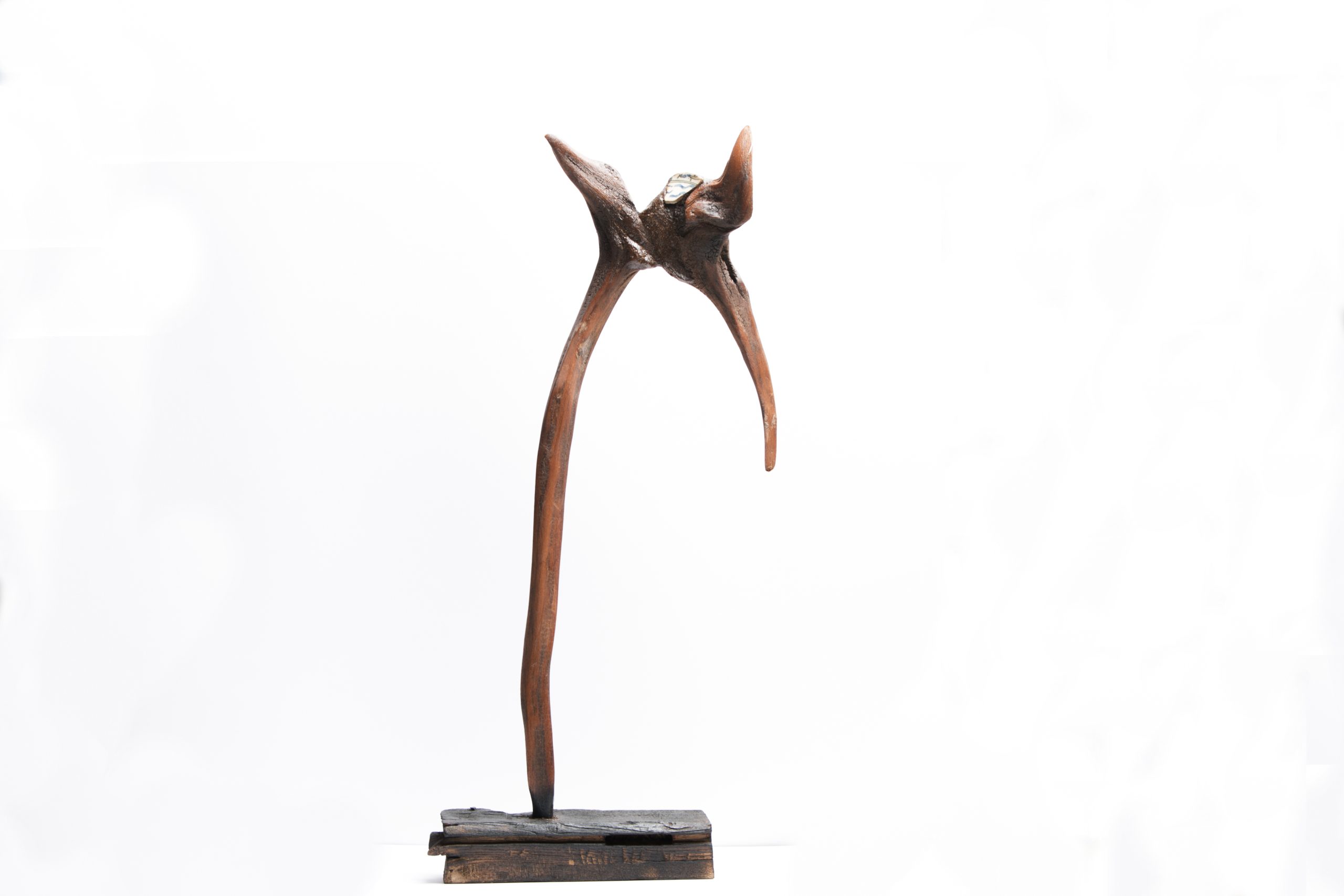 پیکره‌ای کشیده، باریک، و رو به آسمان که دو شاخه در بالاترین نقطه‌اش چون دو بال یا دو نگاه به سوی هم گشوده‌اند. این مجسمه، لحظه‌ای‌ست پیش از پرواز — نه کاملاً رها، نه در بند. آستانه‌ای‌ست میان زمین و آسمان، فردیت و همراهی، ایستایی و رهایی.