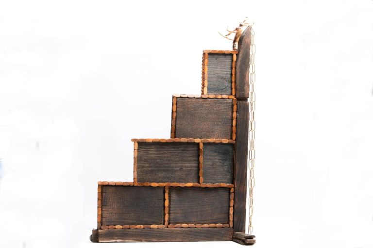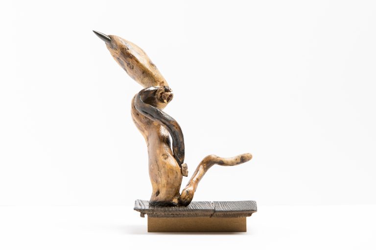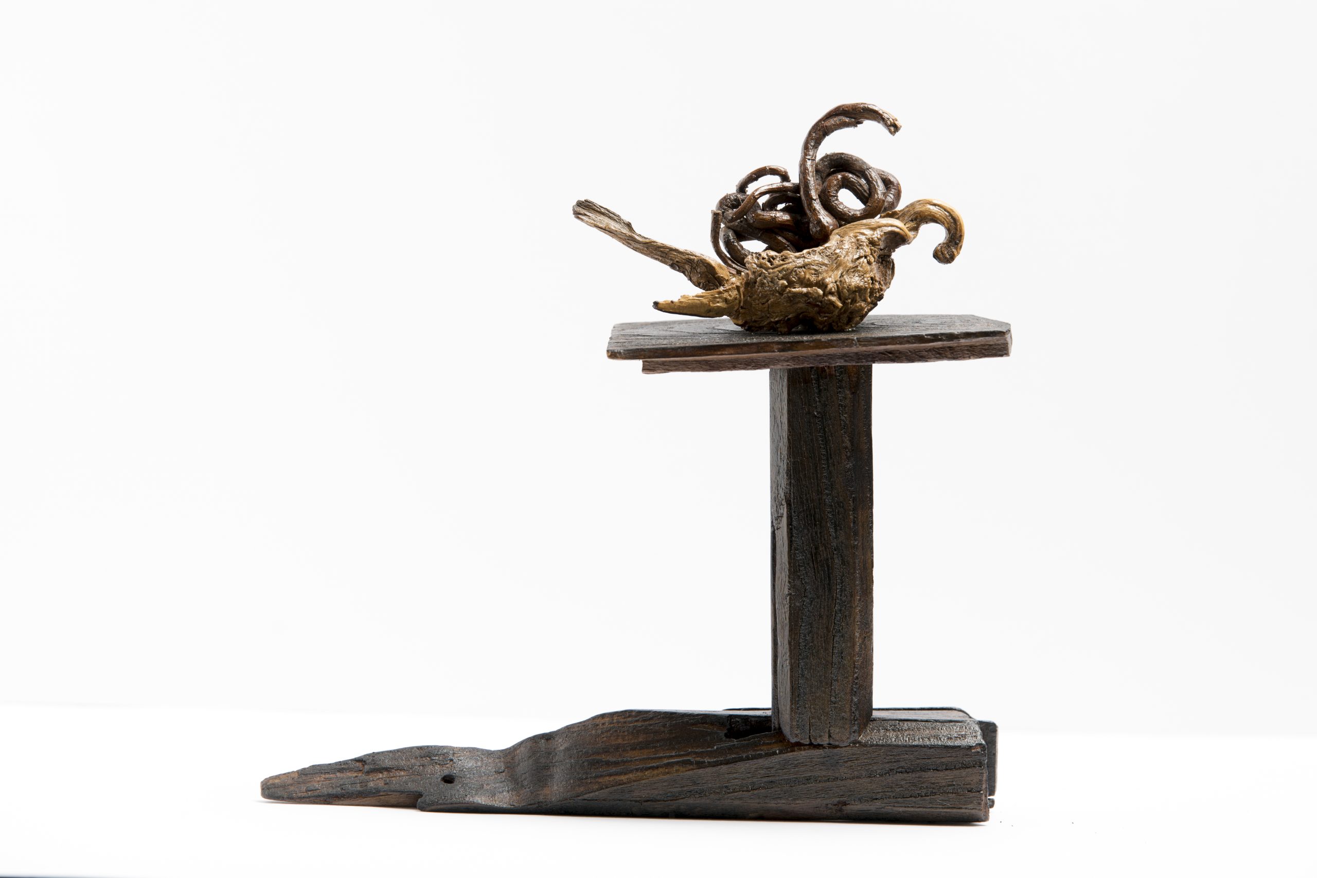 شرح اثر: فرمی خزنده، فریبنده و پیچان، بر سکویی ایستاده که هم تخت است و هم دام. آن‌چه در نگاه اول پرنده‌وار به نظر می‌رسد، در نگاهی دقیق‌تر، زنجیری‌ست که قدرت را به ظاهر می‌آراید و مخاطب را به سلطه دعوت می‌کند. این اثر، نماد فریب پنهان در جایگاه‌های قدرت است.