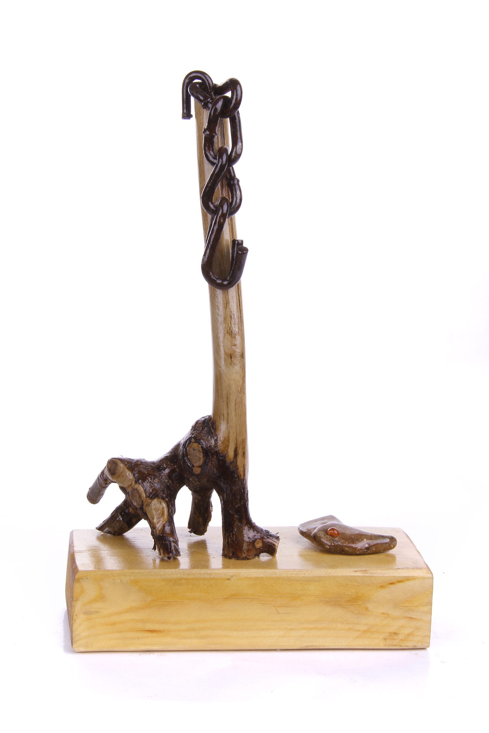 پیکرهای که خمیده، محدود، و در عین حال مصمم به نظر میرسد؛ با زنجیری که از بالاترین نقطهاش آویخته است، اما نه برای اسارت، بلکه برای نمایاندن قدرت ادعای خود. قطعهای منفک، شبیه به دهان یا زبان، در کنار آن قرار دارد، گویی گفتهای بیرونافتاده، یا حقیقتی نیمهجان. «حقِ حقبودن» مجسمهایست از انسانی که در باورش، مطلق است؛ نه شک میپذیرد، نه گفتگو. زنجیر در اینجا، نماد آزادی نیست، نماد اطمینان است — اما اطمینانی که میبندد.
