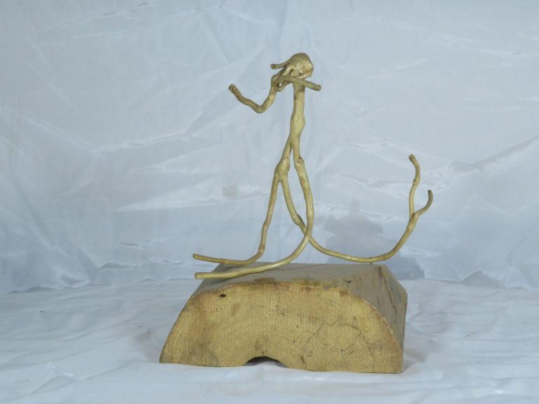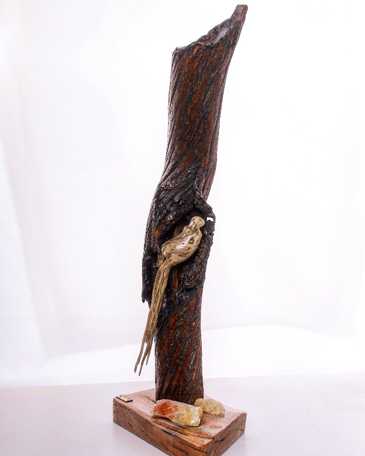 تکنیک : حجم‌سازی با چوب طبیعی برای ساخت پیکره‌ی ایستاده، استفاده از سنگ‌ها و کاشی‌های چسبانده‌شده به‌عنوان عناصر نمادین خاطره و تجربه، و استقرار آن بر پایه‌ی چوبی ساده. ترکیب متریال‌های زمخت و بومی در راستای بازنمایی پیوند میان گذشته و اکنون، و تأکید بر ارزش‌گذاری به زخم‌ها به‌مثابه نشان‌هایی از زیست