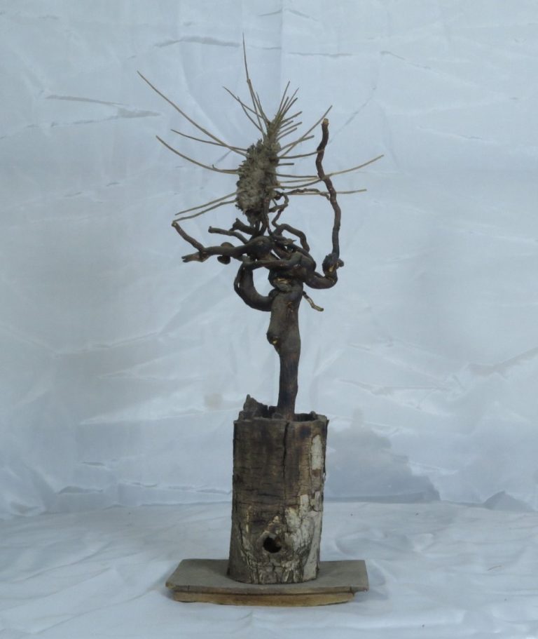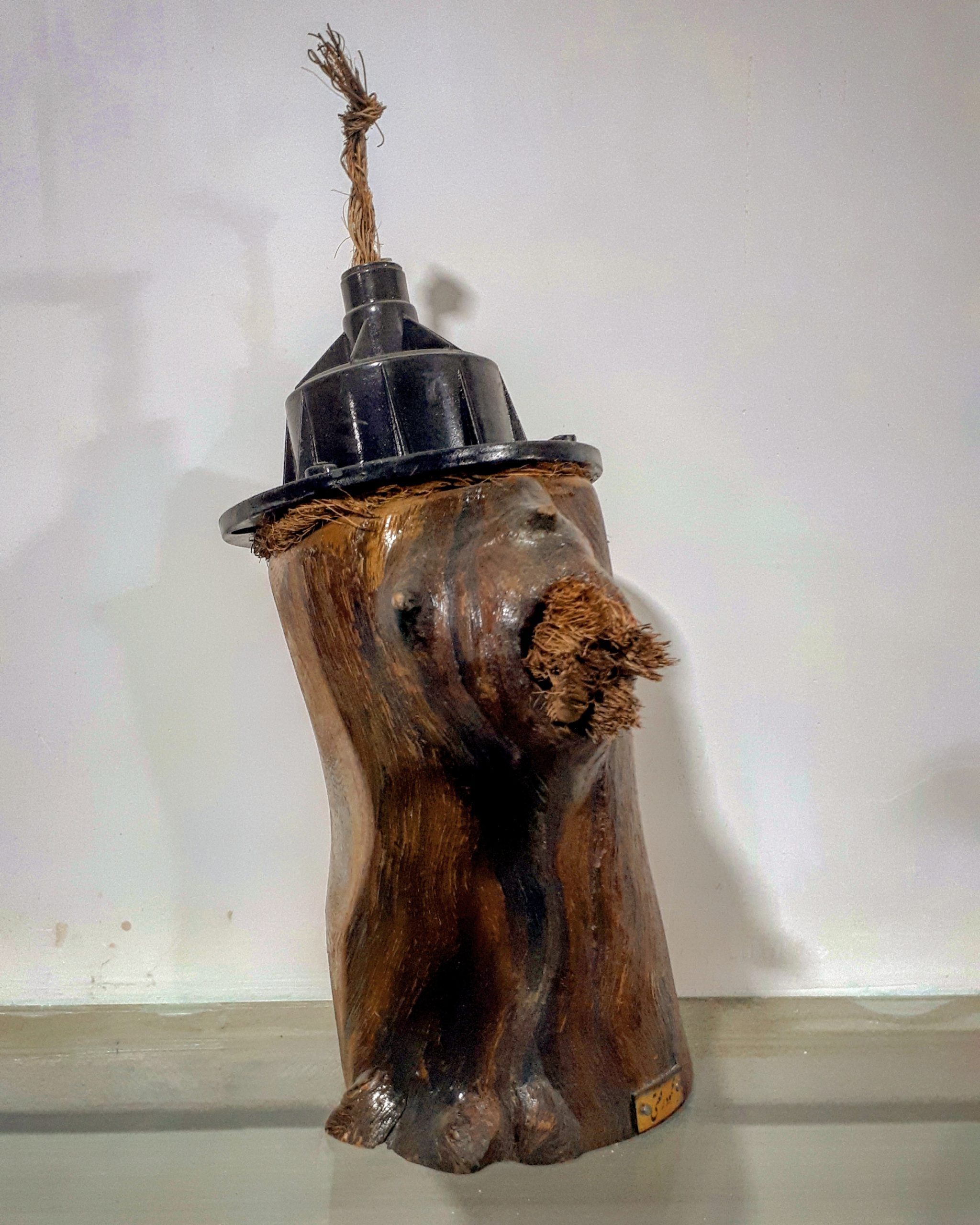 شرح اثر: تنه‌ای چوبی با فرمی انسانی، اما سری از جنس قطعات صنعتی و زبانی از الیاف طناب، بازنمایی موجودی است که در مدار زندگی مدرن گیر افتاده، اما دیگر صدایی برای خروج ندارد. «خاموش در مدار» بازتاب فروکاست انسان به جزء بی‌اراده‌ی سیستم است.