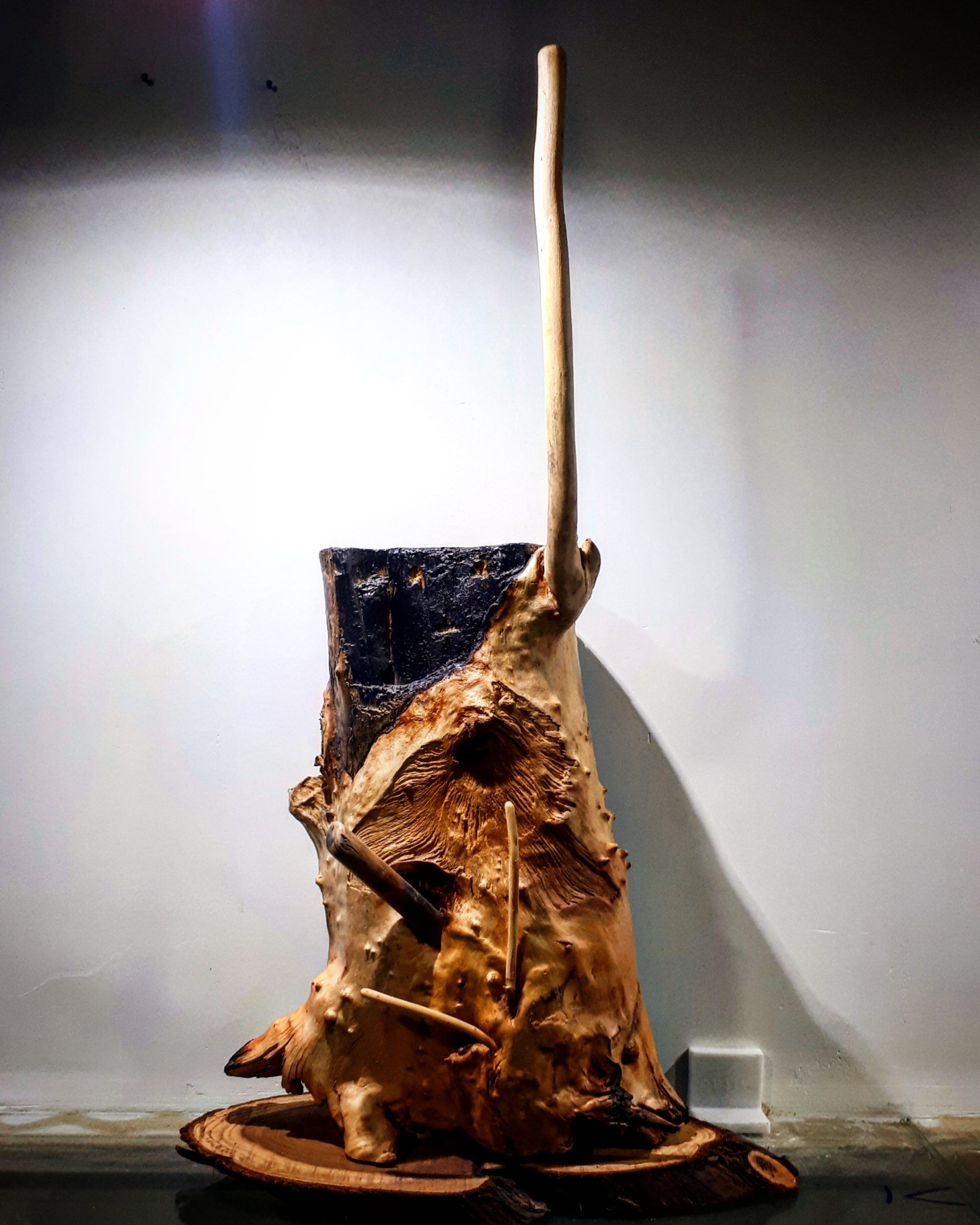 شرح اثر: پیکرهای چوبی با بافتی زنده و شهوتبرانگیز، در کنار قسمتهایی سوخته، نفوذشده و زخمی، بیانگر سهگانهایست از لذت، میل و مصیبت. عنوان «شکاف در تن، میل در جان» نگاهی استعاری به تجربهی انسانی دارد که در آن تمایل جسمانی، منجر به زخمی در عمق جان میشود. مجسمه در مرز میان اغوا و رنج ایستاده است.