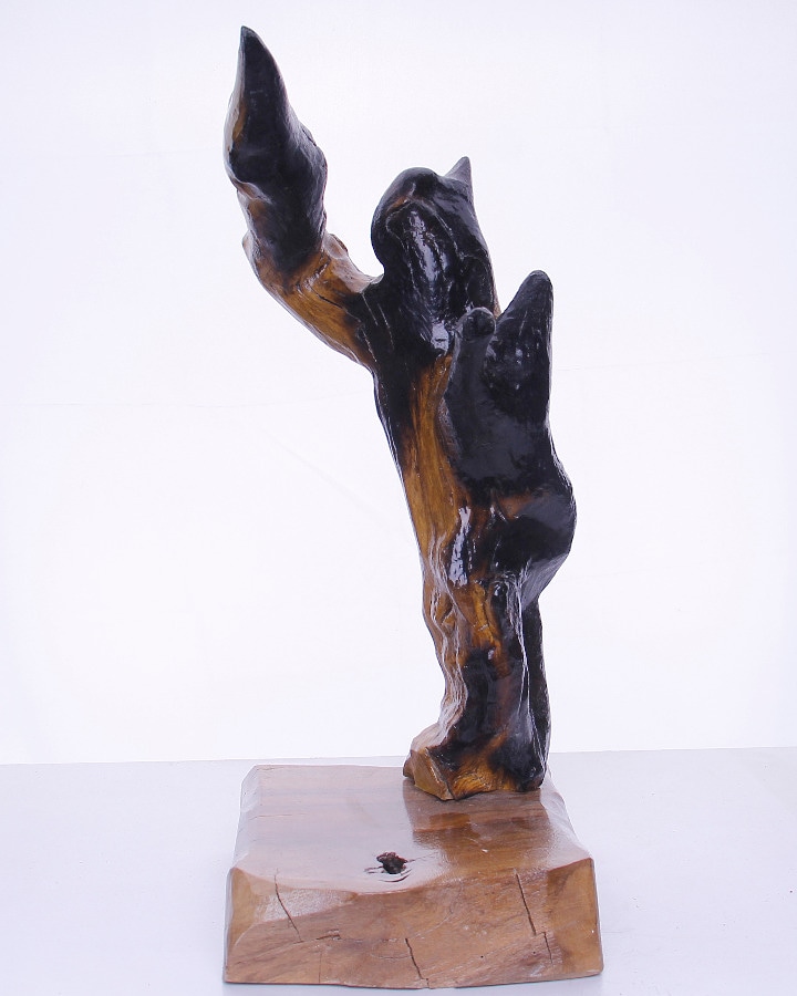 سطح اثر براق و سوخته است—سیاهشدگیِ چوب، نه از زوال، که از سوزش ناشی از کشمکش درونی حکایت دارد. آنچه در وهلهی نخست همچون یک درخت رو به آسمان مینماید، بهزودی پیکرهای میشود که در تلاش برای رسیدن به بالا، در لحظهای از پیشرفت منجمد شده است.
