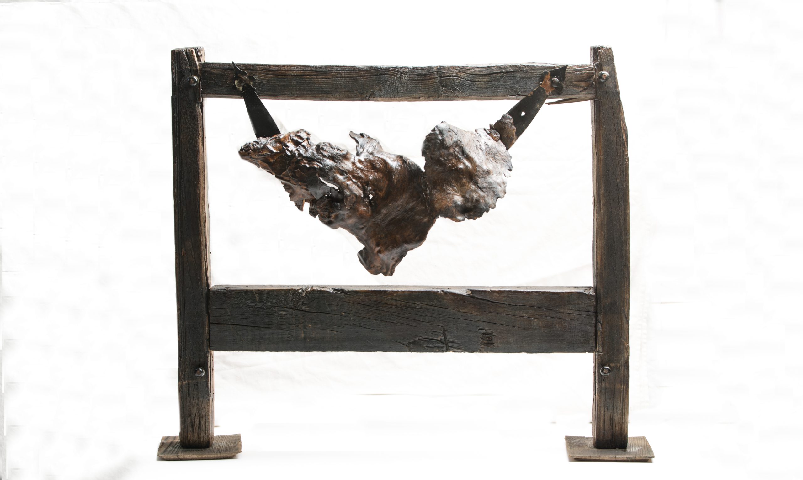 چوب سوخته، زبری خشن زمان و زخم را در خود دارد. بندهای چرمی نه‌تنها پیکره را معلق نگه داشته‌اند، بلکه یادآور طناب، اسارت، و تحمل بی‌پایان بار درد هستند. این عناصر نه برای تزئین، بلکه برای تجربه‌اند—مخاطب را وادار می‌کنند تا با بار جسمی و روانی این «صلیب» روبه‌رو شود.