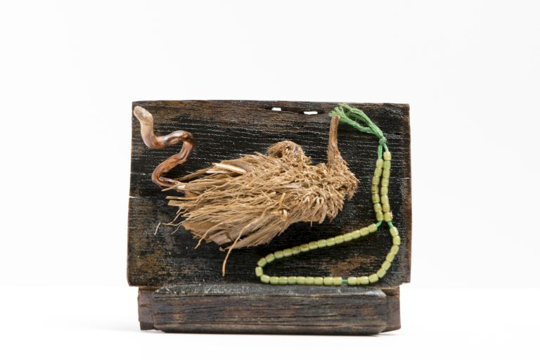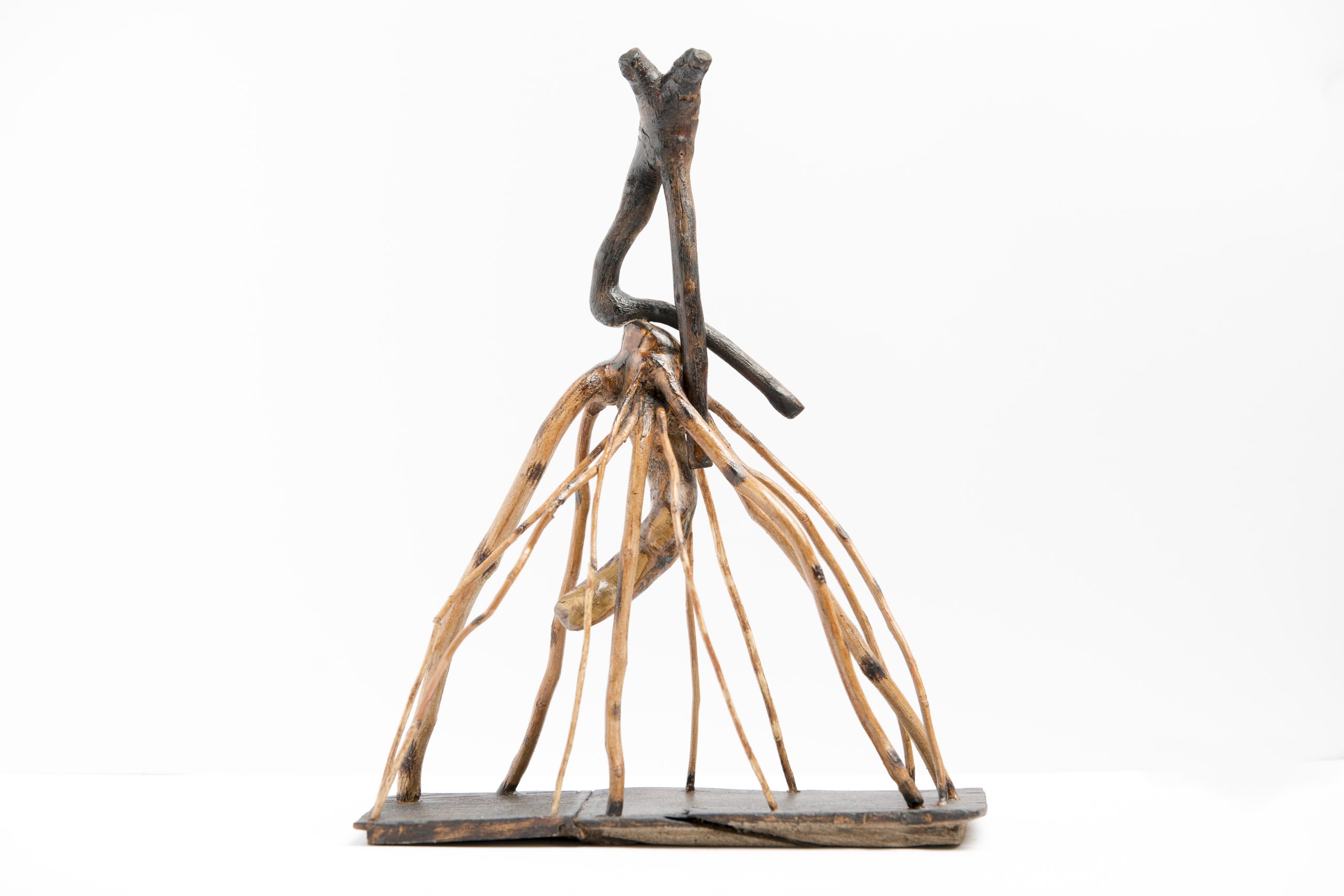 شرح اثر: پیکری انسانی بر ساختاری شبیه قفس از ریشهها نشسته، بیحرکت و منفعل، گویی به بند بودن خو کرده است. اثری تفسیربرانگیز از مرز میان پذیرش و اسارت، خودساختگی و محدودیت.
