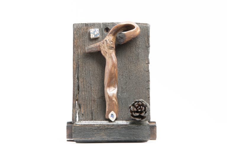 شرح اثر: این مجسمه تجسمی از غروریست که تا مرز خشونت میرود. قامت پیچیده و در حال اوجگیری، در نهایت به نوکی فلزی ختم میشود—نه نماد خرد یا شکوه، بلکه زهرِ پنهانِ خودبزرگبینی. ترکیب چوب با خطی سیاه که دور آن پیچیده، نمادیست از سایهای که حقیقت را پنهان کرده و غروری که نه از درون، بلکه از پوستهای نمایشی تغذیه میکند.