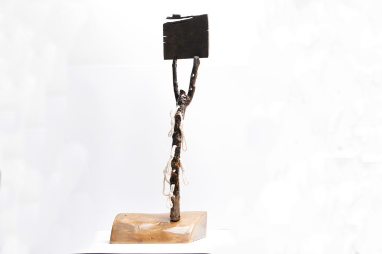 مجسمه، بدن انسان را در موقعیتی معلق به تصویر میکشد: ایستاده اما خم، زنده اما مرده، تنیده در خاک اما همچنان ناظر. زنجیرها، از شاخهای که شاید نماد دانایی یا حیات باشد، فرو افتادهاند؛ نه برای بستن، که برای یادآوری: حتی در اوج ایستادگی، ما فرزندان زوالایم.