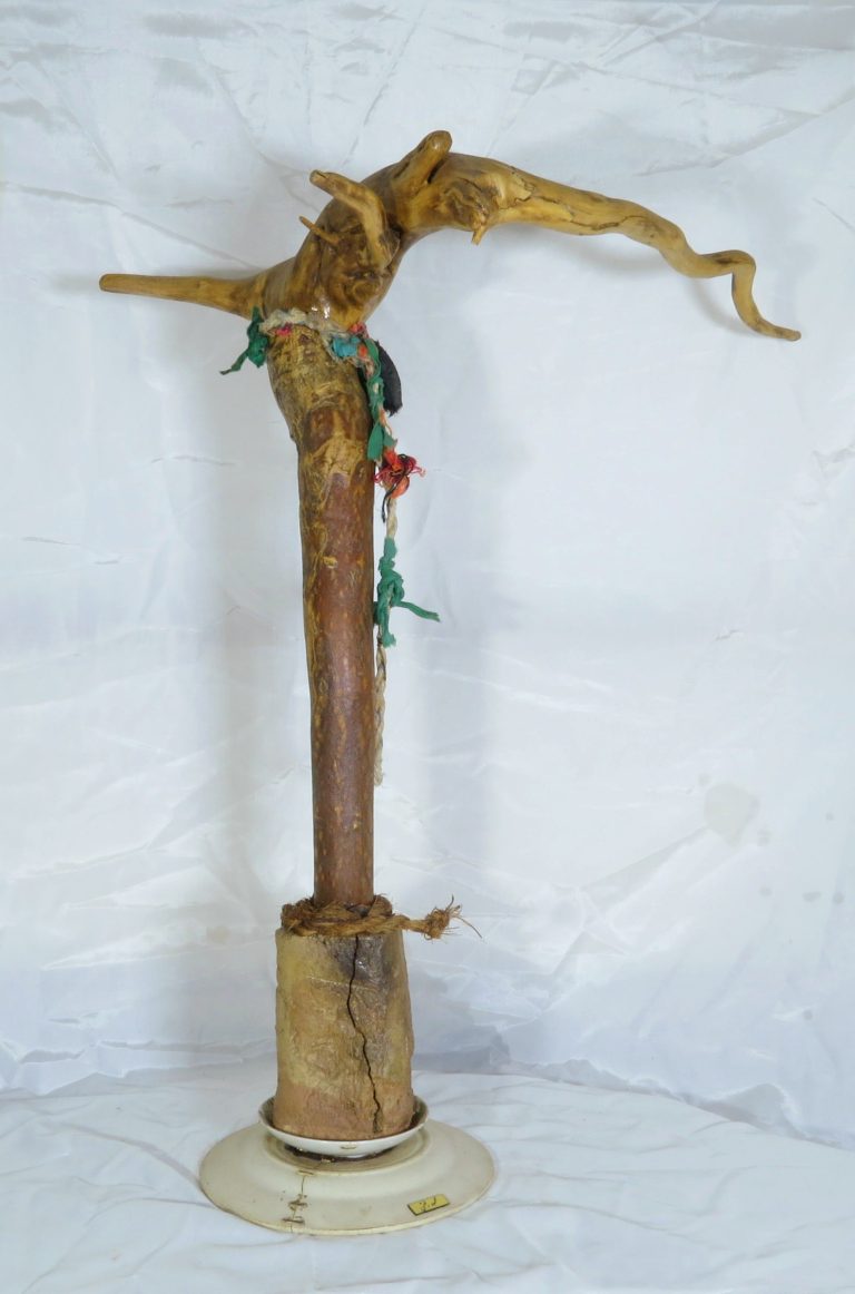 پایهی اثر با چوبی خمیده و ارگانیک، حالتی از نیایش یا تسلیم را تداعی میکند—گویی انسانی در برابر چیزی که نمیفهمد، زانو زده است.