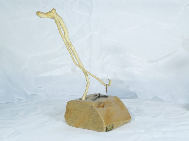 Technique : Sculpting with raw-textured natural wood, using metal chain as a conceptual element to represent inner conflict. Emphasis on conveying psychological and physical tension through sculptural forms and unrefined materials
