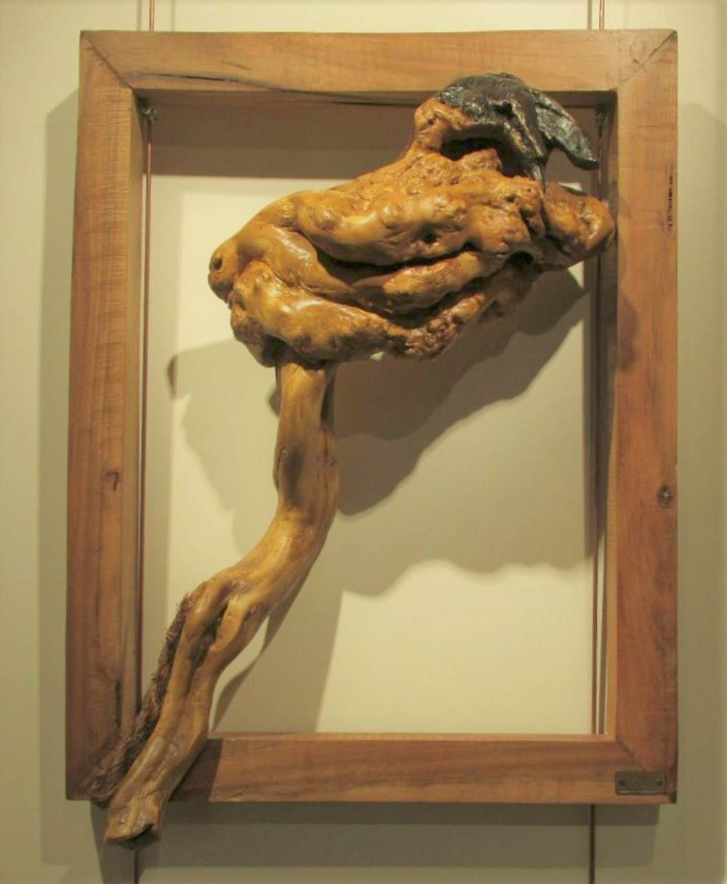 A dense, knotted form resembling the human brain is trapped within a wooden frame. Part of it pushes beyond the frame’s border, yet the top is visibly charred. The frame is no protector—it is a prison for a mind attempting escape, at the cost of burning part of itself. This sculpture stands as a metaphor for a mind that won’t fit—and must burn to break free.