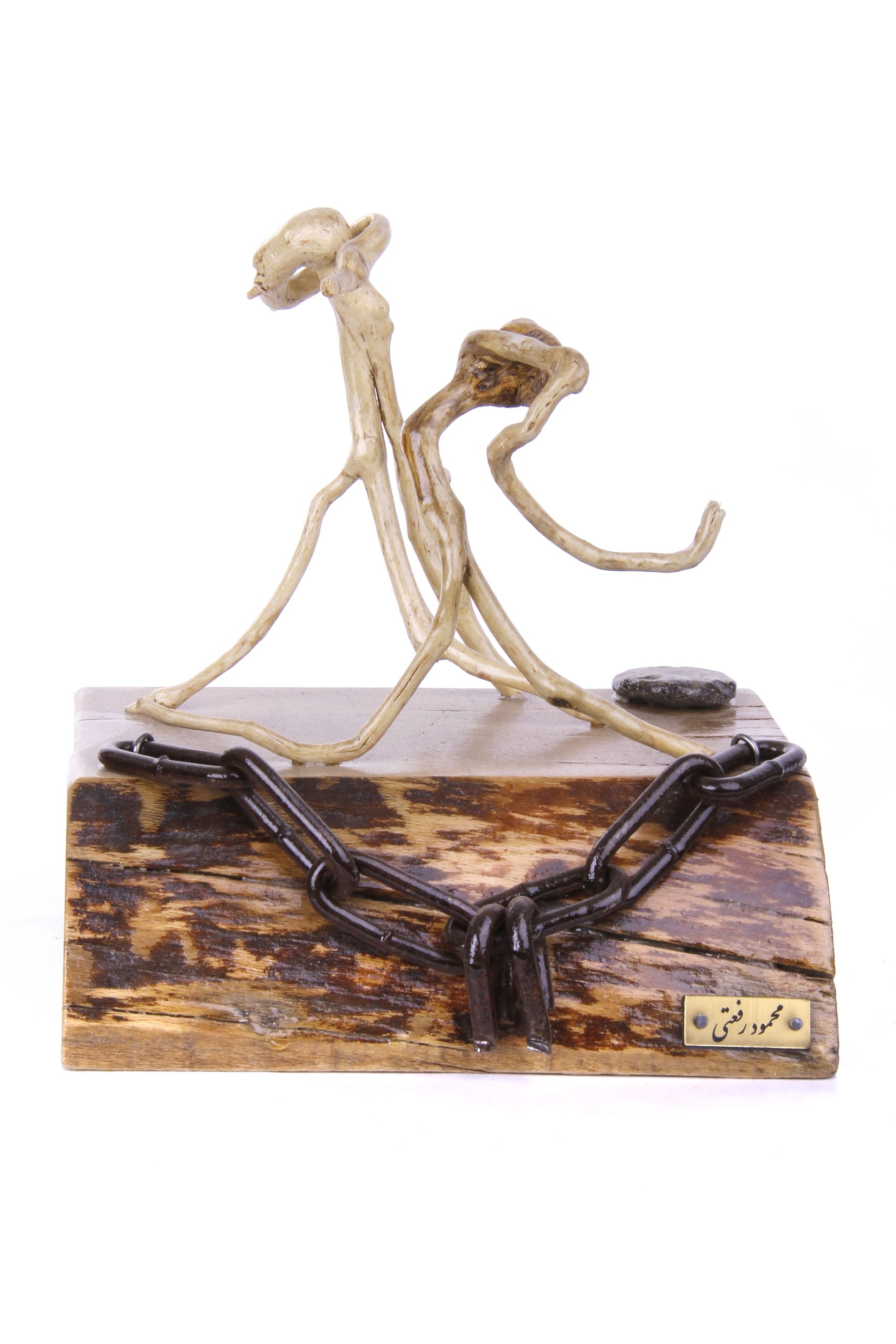 Material : Natural wood, two simplified human figures in parallel motion, a heavy chain in the foreground, faded and earthy wood texture