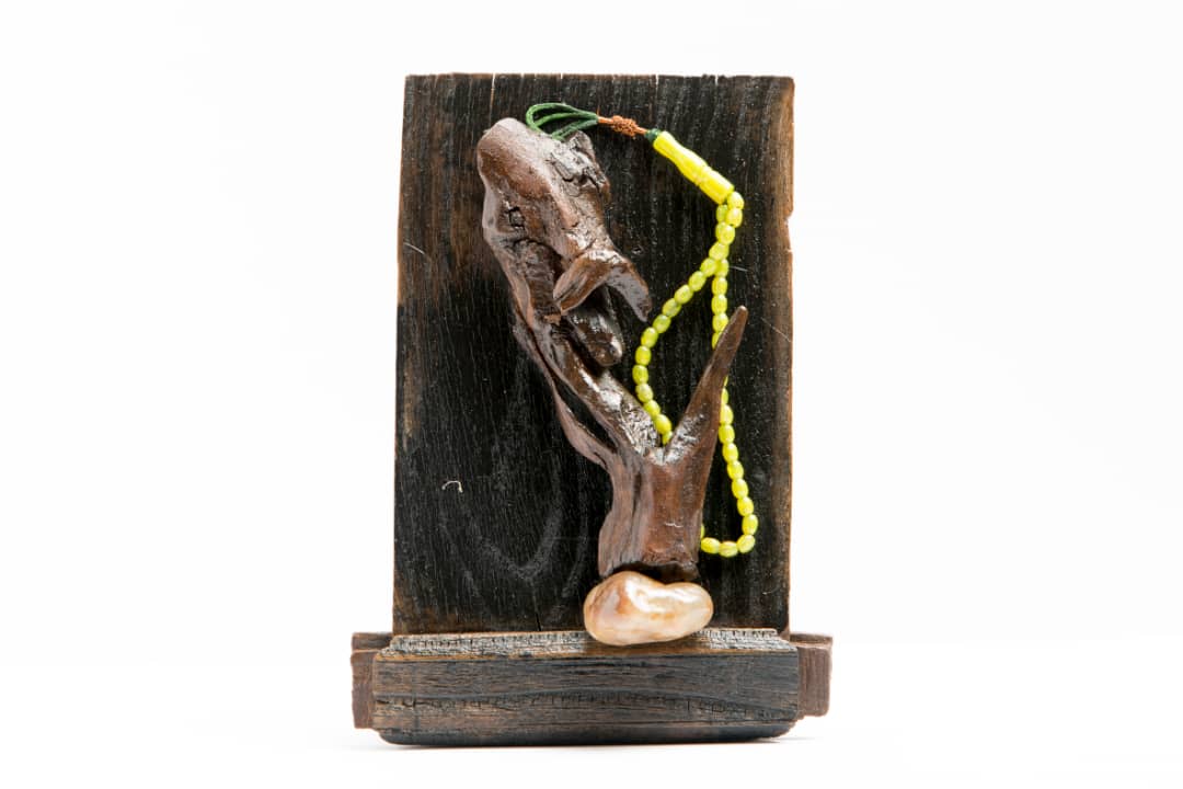 This sculpture reconstructs the human body not with flesh and bone, but with fractured wood and silent anguish. A figure appears bound by yellow prayer beads—not as a symbol of devotion, but as chains tightening around its truth.