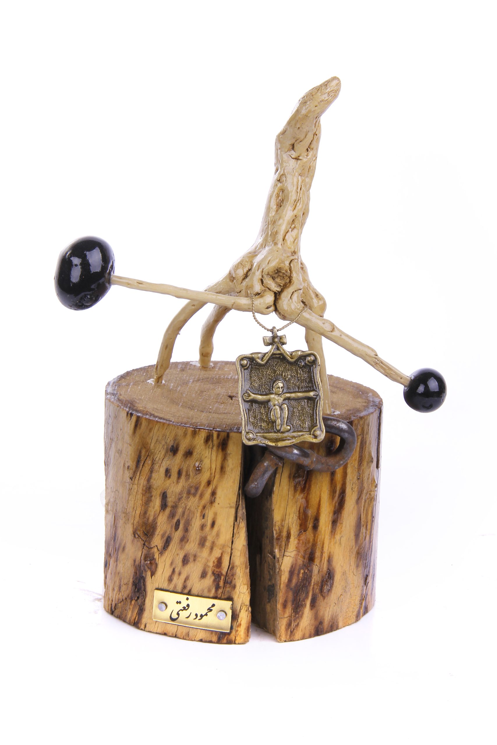 A seemingly balanced figure with outstretched arms and attached weights, projecting strength and poise. Yet a hanging medal and a cracked base betray a different truth: this champion is manufactured by a corrupt system. *Fabricated Champion* is an allegory of the professional sports world, where glory is not earned but produced through hidden deals, commerce, and systemic decay. It’s a reflection on the gap between image and reality, and the human body reduced to spectacle.