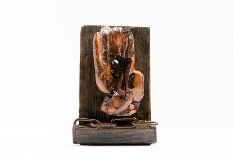 This piece is a poetic embodiment of grief, motherhood, and fate. A curved figure rises from the earth, one arm lifted skyward—perhaps in supplication or protest—while a small, lifeless form lies in its lap. The wood’s texture, raw and twisted, suggests both the collapse and endurance of the body. Amber-like beads wrap around the form like veins of memory, loss, or silent devotion.