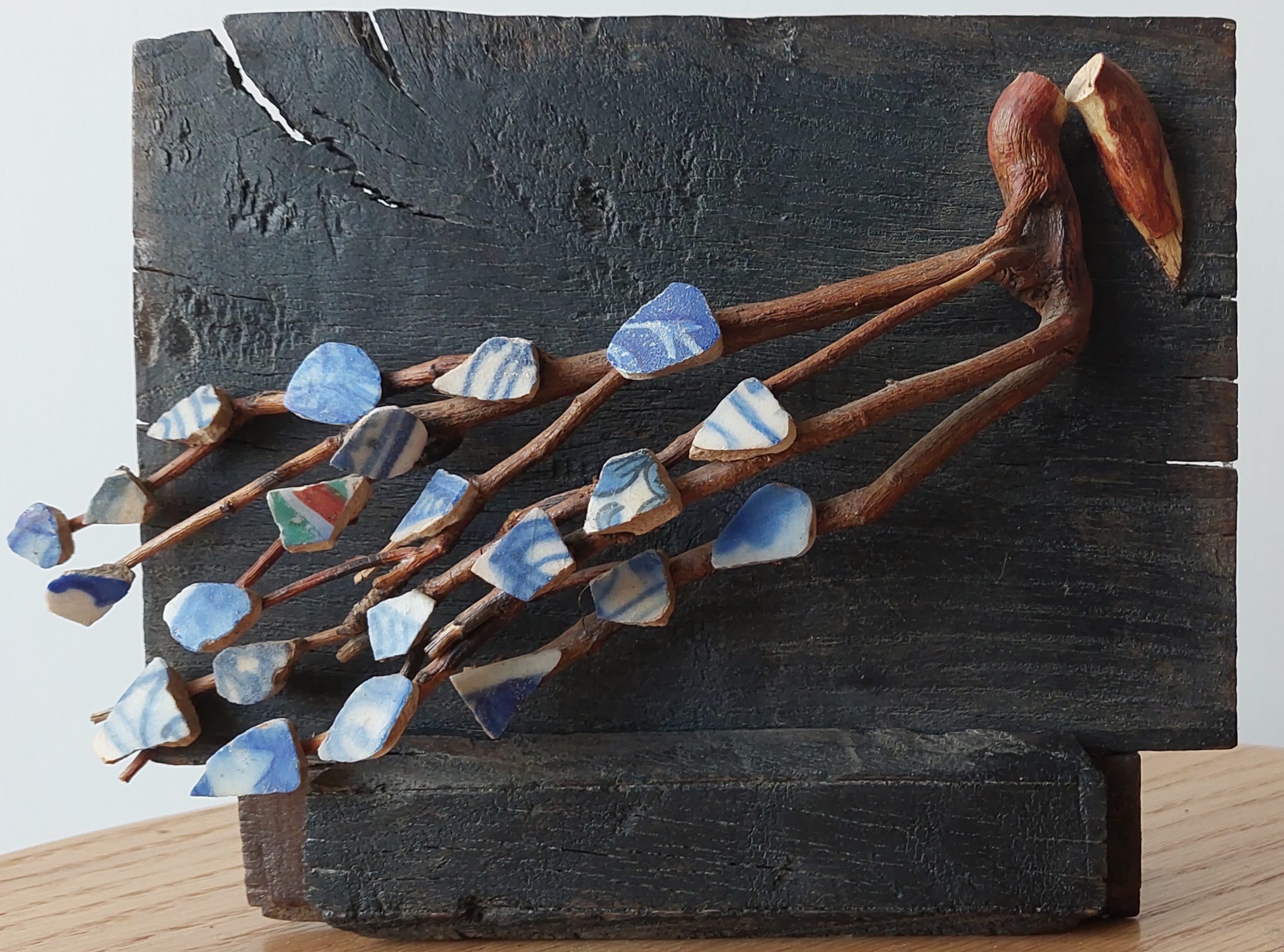 The combination of raw wood, broken porcelain, and a darkened base communicates a quiet violence: