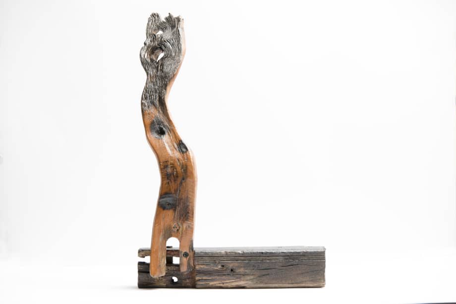 The raw grain of the wood, its scorched surface, and eroded lines do not decorate — they declare.