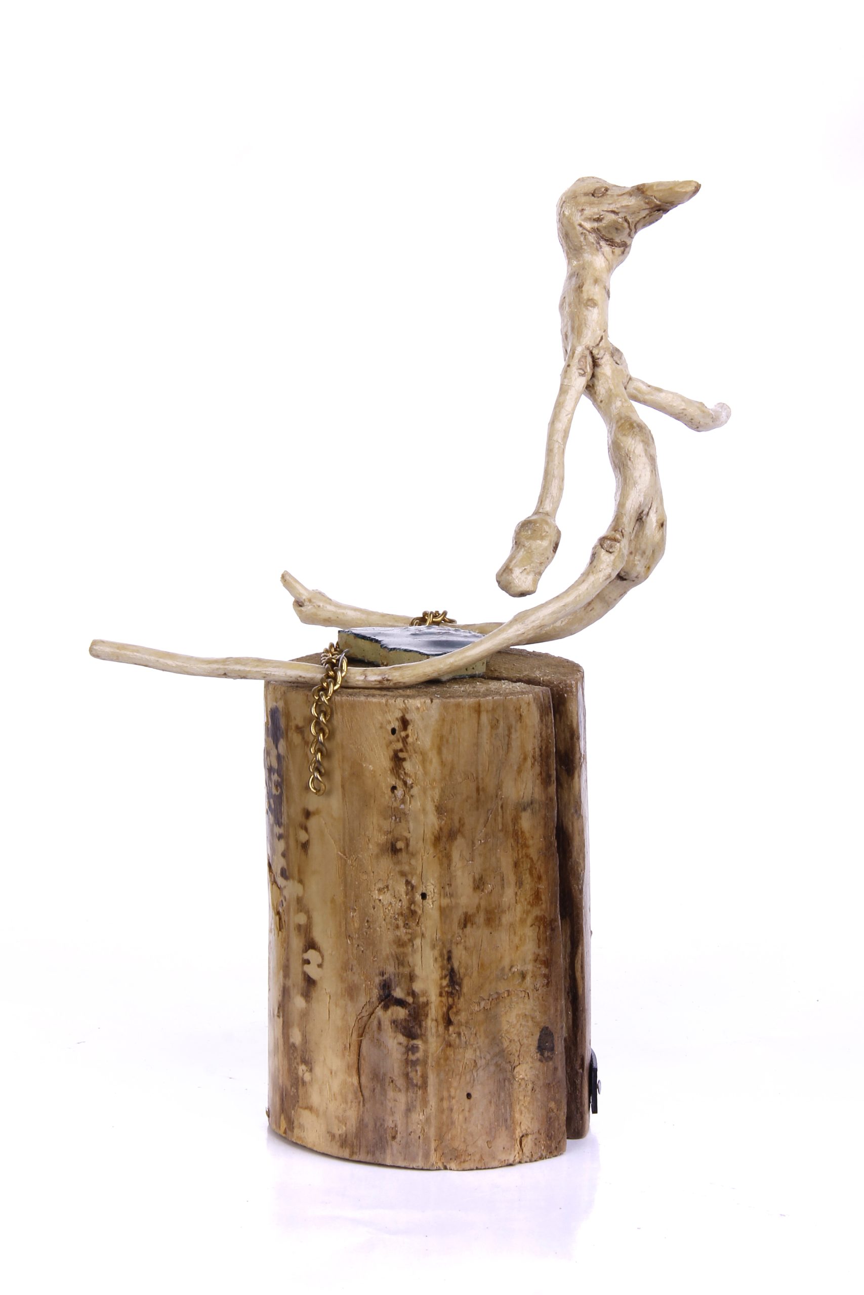 Material : A seated figure on a cylindrical wood base, with an elongated, unnatural body, a short chain dangling from the side, and a gaze fixed forward