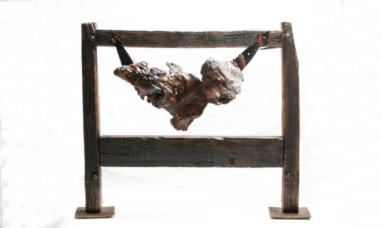 Description: ‘In the Frame of Wound and Hope’ captures the essence of contemporary Iran — wounded, shrouded in mourning, yet unbroken. The clenched fist rising from the darkness symbolizes defiance and resilience. The wooden frame echoes the cracked walls of forgotten homes. This sculpture embodies not a single person, but a nation: standing on pain, looking toward liberation.