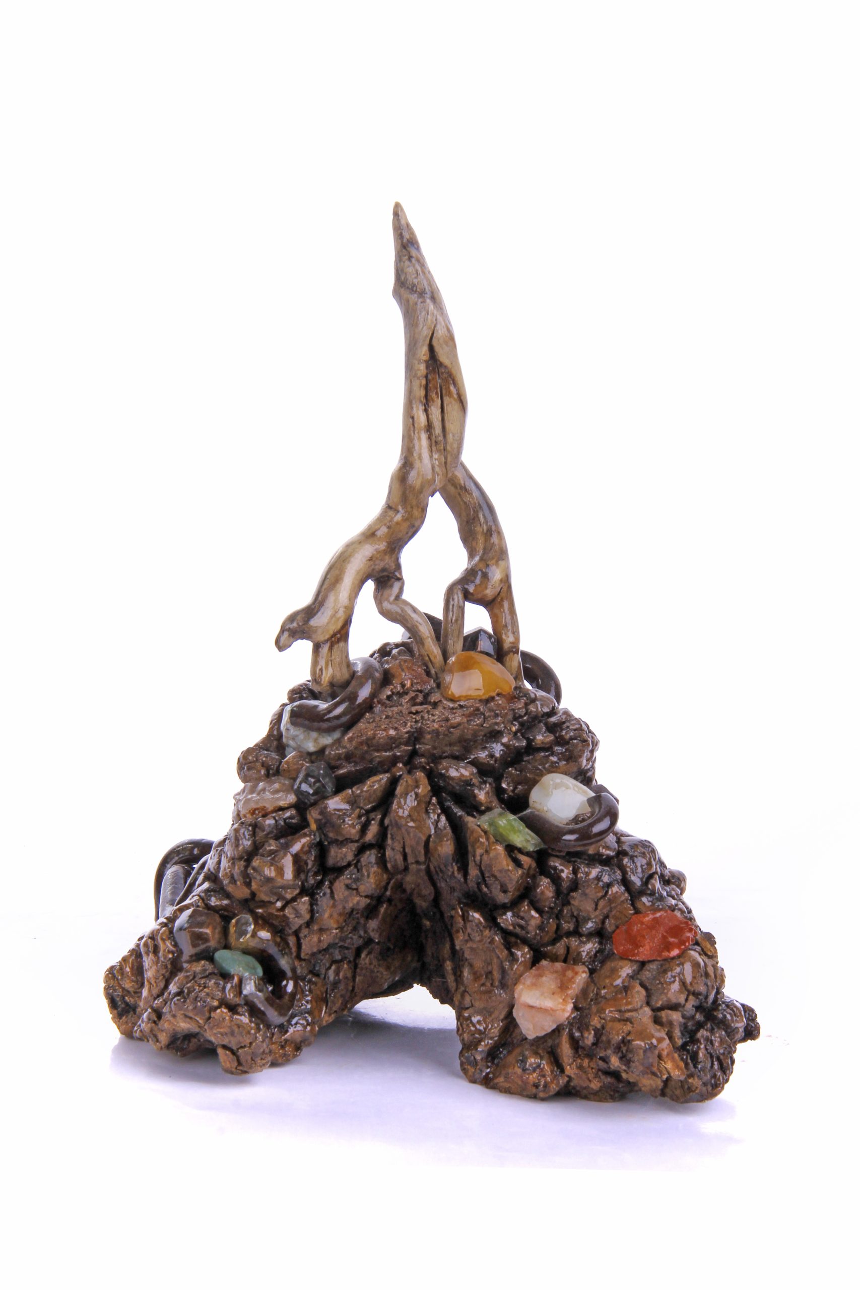 Material : Textured wood with mineral veins, a standing figure atop a base of colorful stone-like forms, with interwoven metal chains