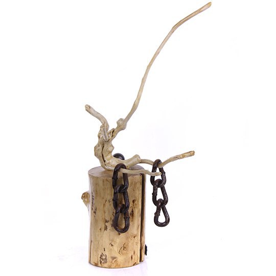 Description: A slender, delicate figure stands atop a high and precarious pedestal, its head bound by a mass of chain. The title *Pride on the Edge of Collapse* offers a metaphorical view of a human being positioned in imagined greatness while mentally shackled. The sculpture portrays a fragile balance between inflated ego and imminent fall.