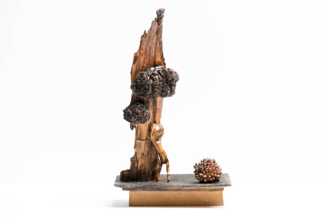 This piece stands quietly on a raw, unpolished base. A vertical, scarred piece of wood—like the withered trunk of a dead tree or the memory of something that once stood strong—rises at the center. Upon its surface, dark, tumor-like clusters have formed—organic deformities, growths of something deeper.