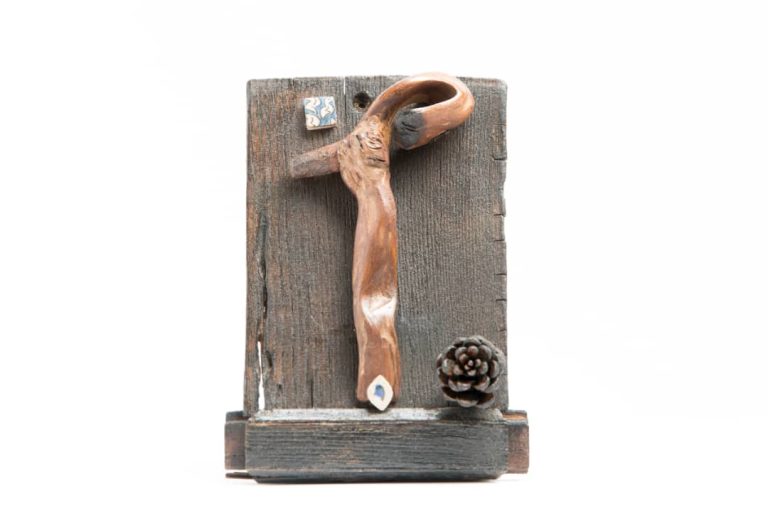 • The materials—wood and metal—embody a contrast between nature and threat, softness and fracture.