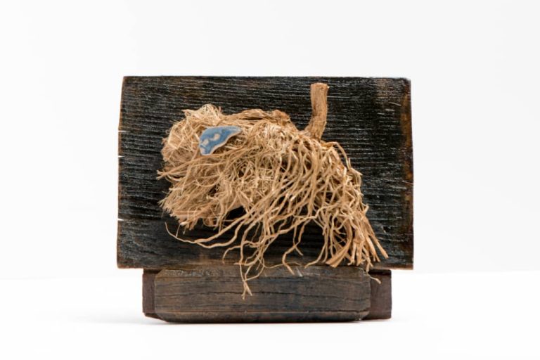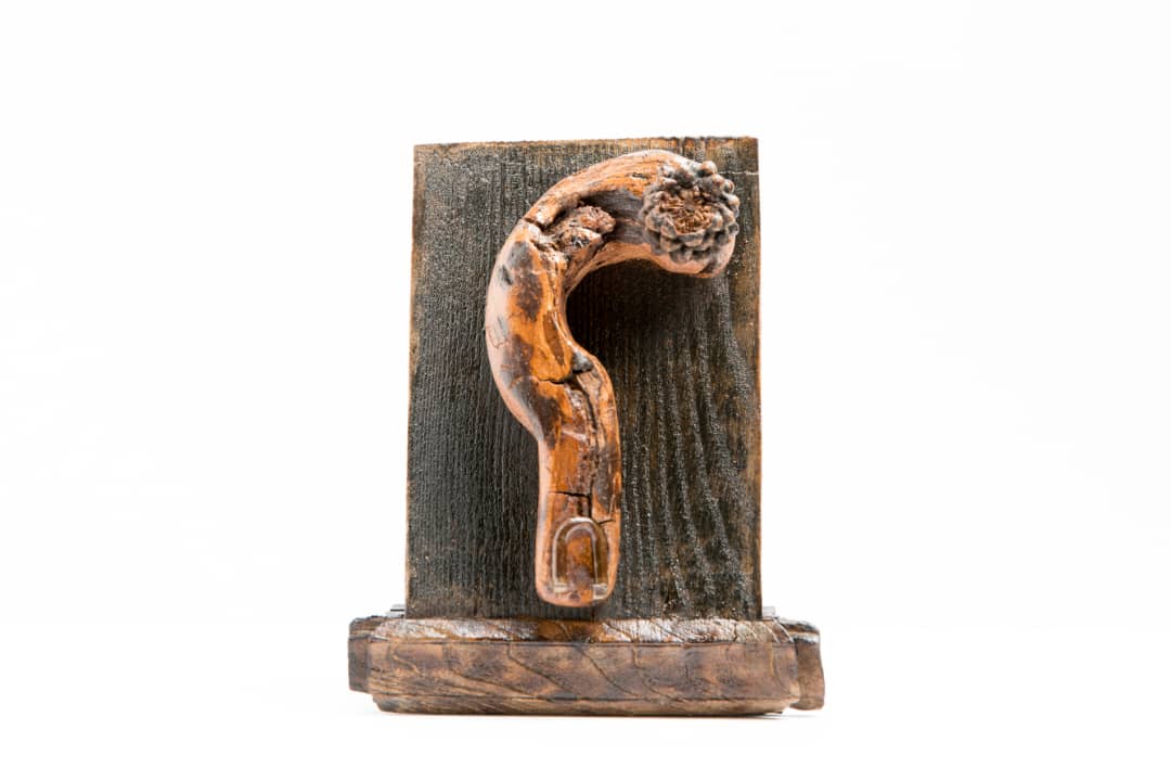 Here, the question is alive, carved from wood, wounded, textured, and incomplete.