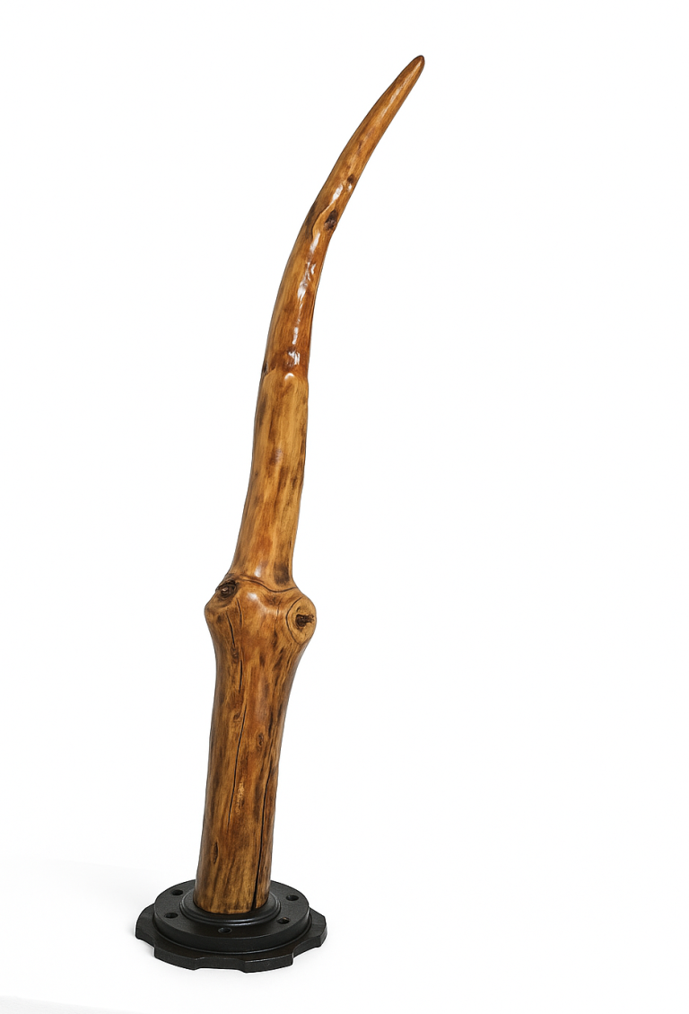 This sculpture features a thick, curved piece of highly polished wood, shaped like a partial human torso.